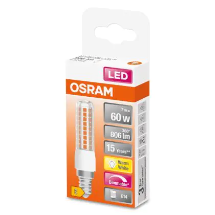 La lampada Osram Special T Slim LED E14 Chiara 6.5W 806lm - 827 Bianco Molto Caldo | Dimmerabile - Sostitutiva 60W è il sostituto perfetto per le tue vecchie lampade 60W con attacco a vite piccolo E14 grazie alla sua tecnologia LED. Passare a LED ti offrirà molti vantaggi!